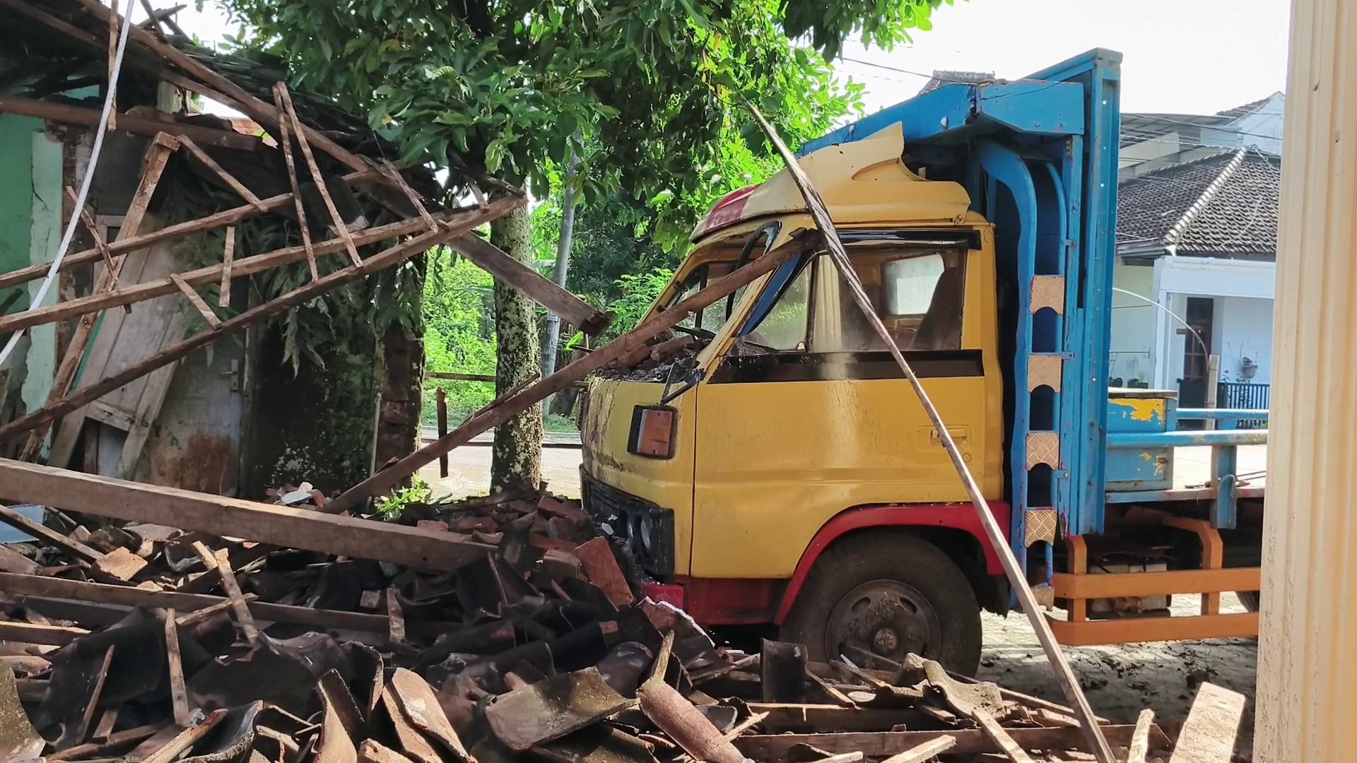 Warga yang mendengar suara keras langsung mendatangi lokasi dan mendapati gudang telah rata dengan tanah, sementara truk mengalami kerusakan akibat tertimpa material bangunan.