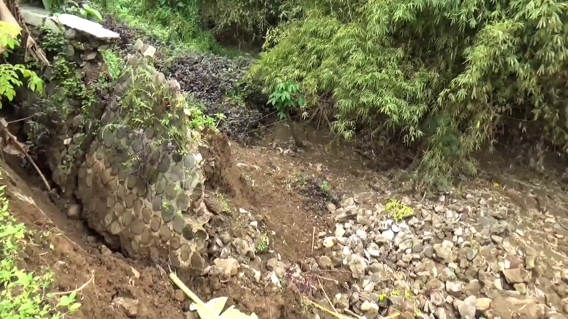 “Kerusakan sudah terjadi sekitar satu bulan lalu dan mengalami kerusakan susulan. Setelah gempa kemarin, kondisinya semakin parah. Dampaknya, banyak rumah di sekitar yang terancam. Selain itu, aliran sungai juga tertutup material plengsengan dan bambu,” kata Soimun, Ketua RT.